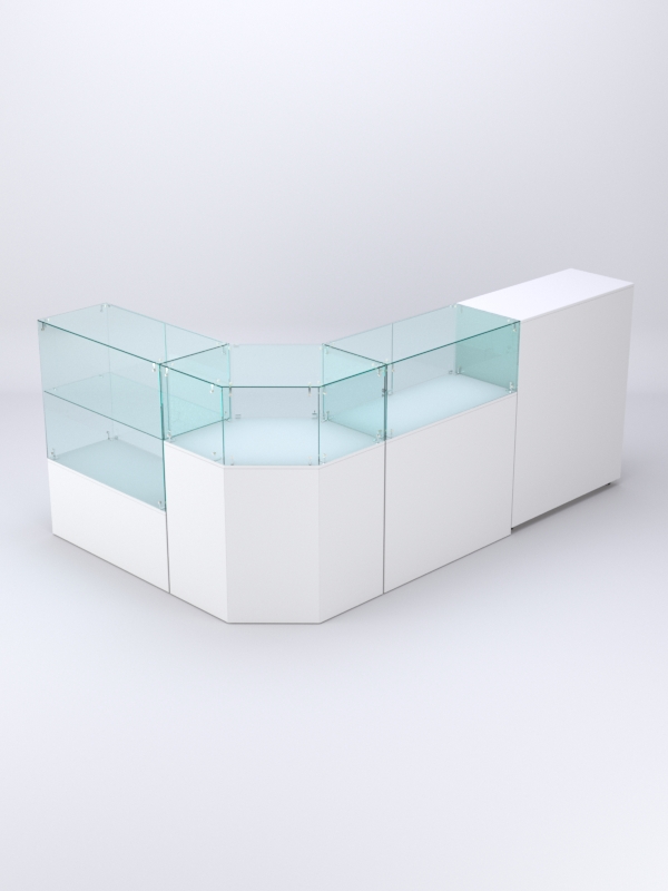 Комплект включает прямоугольный прилавок с полкой, прямоугольный прилавок без полки, шестиугольный прилавок и закрытый прилавок.