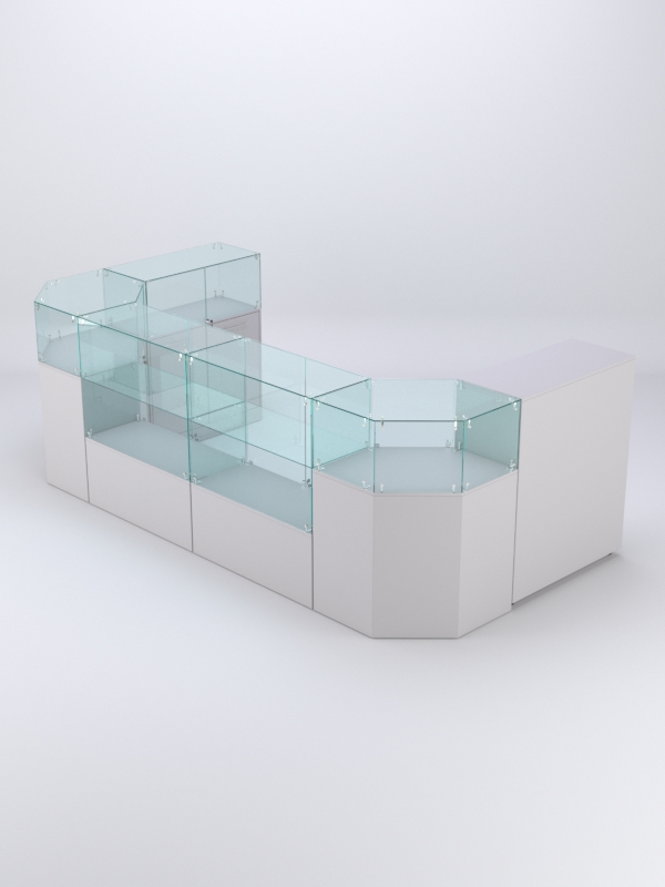 Комплект включает 2 прямоугольных прилавка с полкой, прямоугольный прилавок без полки, 2 шестиугольных прилавка и закрытый прилавок.