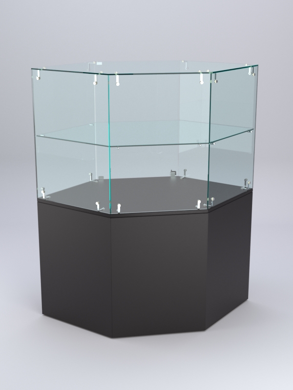 Прилавок состоит из накопителя и витрины с полкой. Модель имеет шестигранную форму. Оба элемента оборудованы дверками, закрывающимися на ключ.