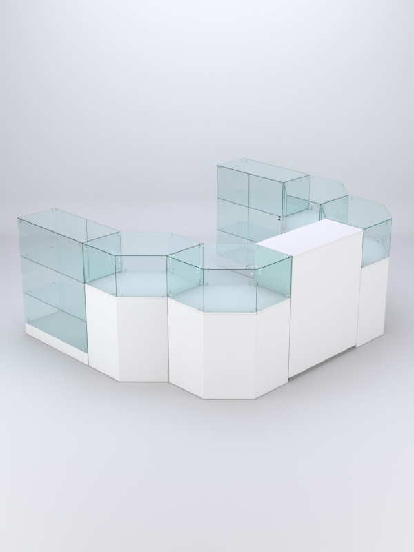 Комплект включает 2 прямоугольных прилавка с 2-мя полками, 4 шестиугольных прилавка с 1-ой полкой и закрытый прилавок.