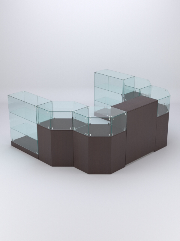 Комплект включает 2 прямоугольных прилавка с 2-мя полками, 4 шестиугольных прилавка с 1-ой полкой и закрытый прилавок.
