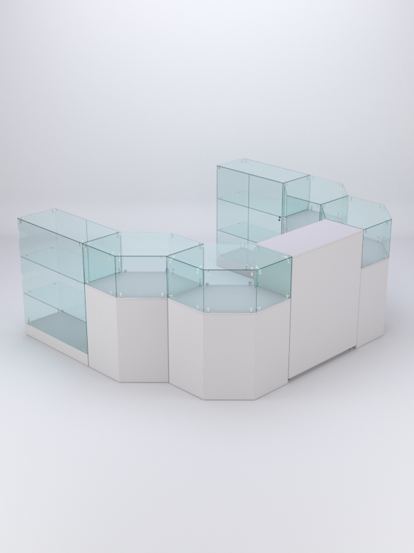 Комплект включает 2 прямоугольных прилавка с 2-мя полками, 4 шестиугольных прилавка с 1-ой полкой и закрытый прилавок.