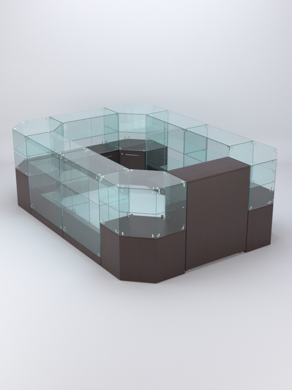 Комплект включает 4 прямоугольных прилавка с 2-мя полками, прямоугольный прилавок с 1-ой полкой, 4 шестиугольных прилавка с 1-ой полкой и закрытый прилавок.