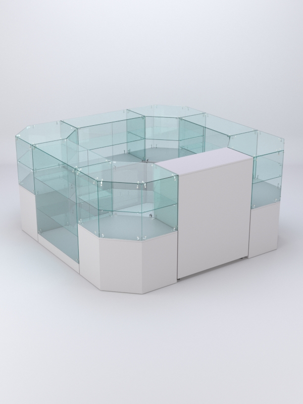 Комплект включает 2 прямоугольных прилавка с 2-мя полками, 1 прямоугольный прилавок с полкой, 4 шестиугольных прилавка с полкой и закрытый прилавок.