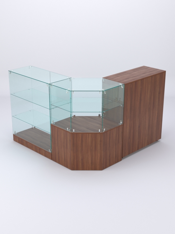 Комплект включает прямоугольный прилавок с 2-мя полками, шестиугольный прилавок с полкой и закрытый прилавок.