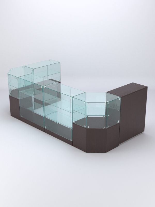 Комплект включает 2 прямоугольных прилавка с 2-мя полками, прямоугольный прилавок с 1-ой полкой, 2 шестиугольных прилавка с полкой и закрытый прилавок.