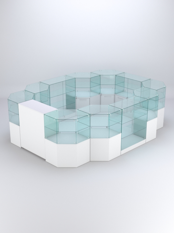 Комплект включает 2 прямоугольных прилавка с 2-мя полками, прямоугольный прилавок с 1-ой полкой, 8 шестиугольных прилавка с полкой и закрытый прилавок.