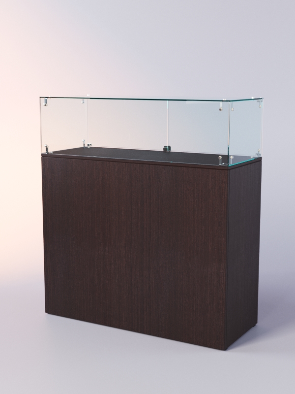 Каркас прилавка выполнен из ЛДСП. Корпус витрины стеклянный. Витрина и накопитель оборудованы распашными дверцами, открывающимися с внутренней стороны.