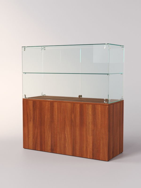 Каркас прилавка выполнен из ЛДСП. Корпус и полка витрины стеклянные. Витрина и накопитель оборудованы распашными дверцами, открывающимися с внутренней стороны.