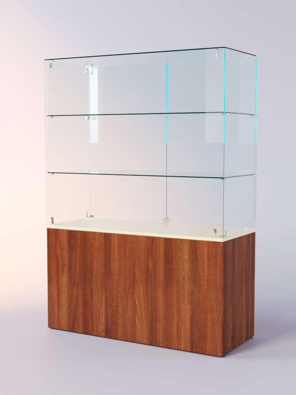 Каркас прилавка выполнен из ЛДСП. Корпус и полки витрины стеклянные. Витрина и накопитель оборудованы распашными дверцами, открывающимися с внутренней стороны.