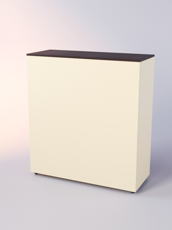 Внешняя сторона прилавка полностью закрыта со стороны покупателя. С внутренней стороны имеется большое отделение и накопитель с распашными дверцами.