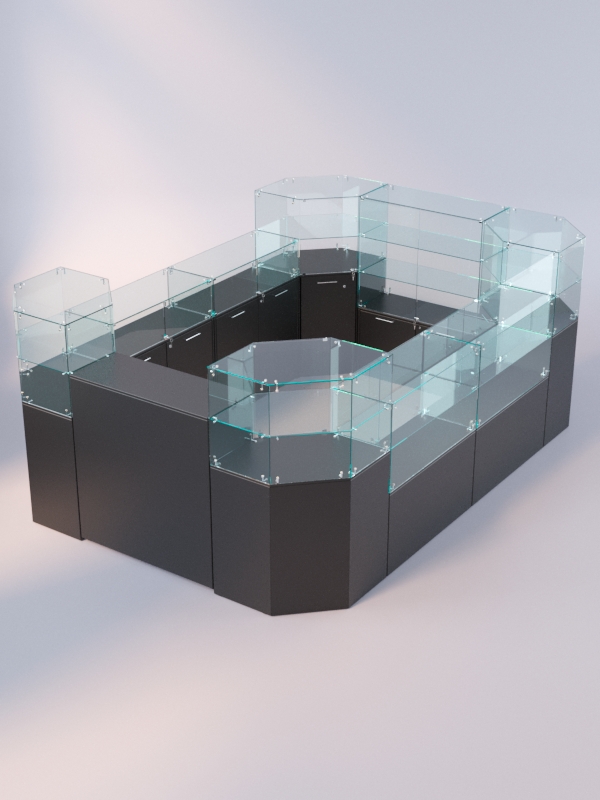 Комплект прилавков предназначен для продажи солнцезащитных и корректирующих очков на территории торгового центра, гипермаркета, вокзала, в салоне оптики.
