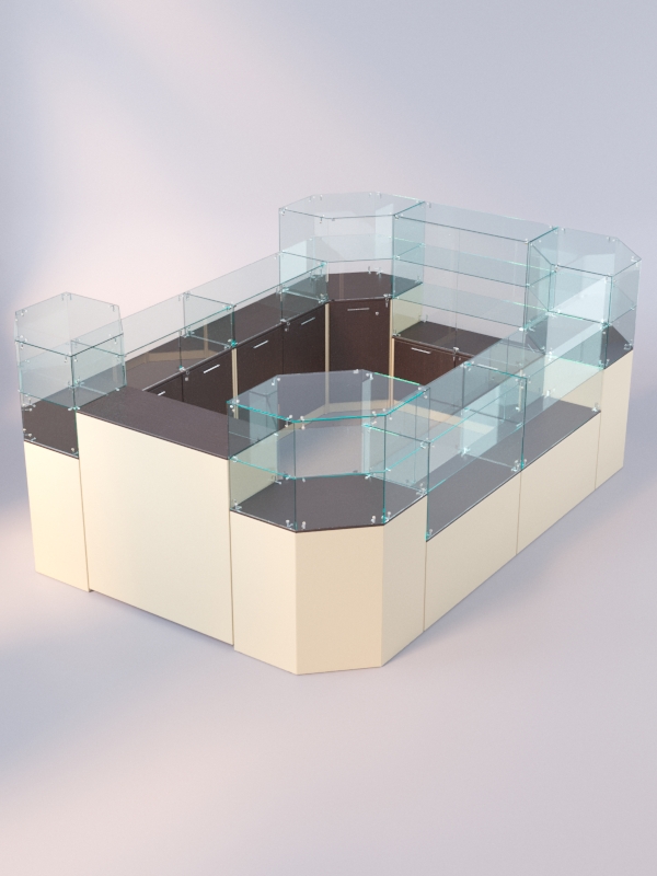 Данная модель представляет собой закрытую систему из нескольких прилавков. Сюда входят прилавки с витриной, содержащие разное количество полок, а также закрытый выкатной прилавок.