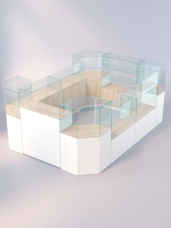 Комплект прилавков предназначен для продажи солнцезащитных и корректирующих очков на территории торгового центра, гипермаркета, вокзала, в салоне оптики.