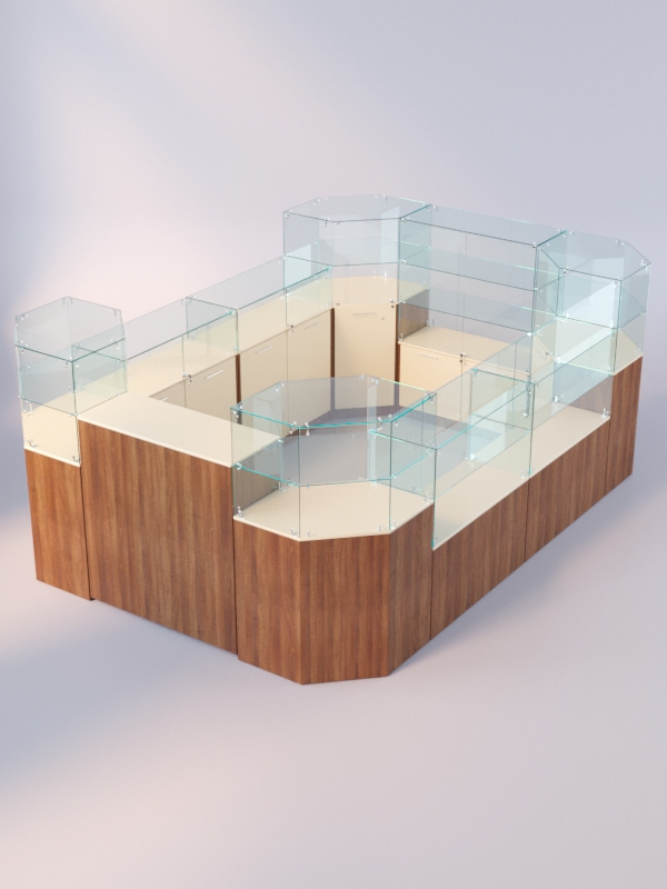 Каркас прилавков выполнен из ЛДСП. Корпус и полки витрин изготовлены из стекла. Витрины содержат 1-2 полки. Нагрузка на одну полку составляет 5-7кг, с условием равномерного распределения товаров.