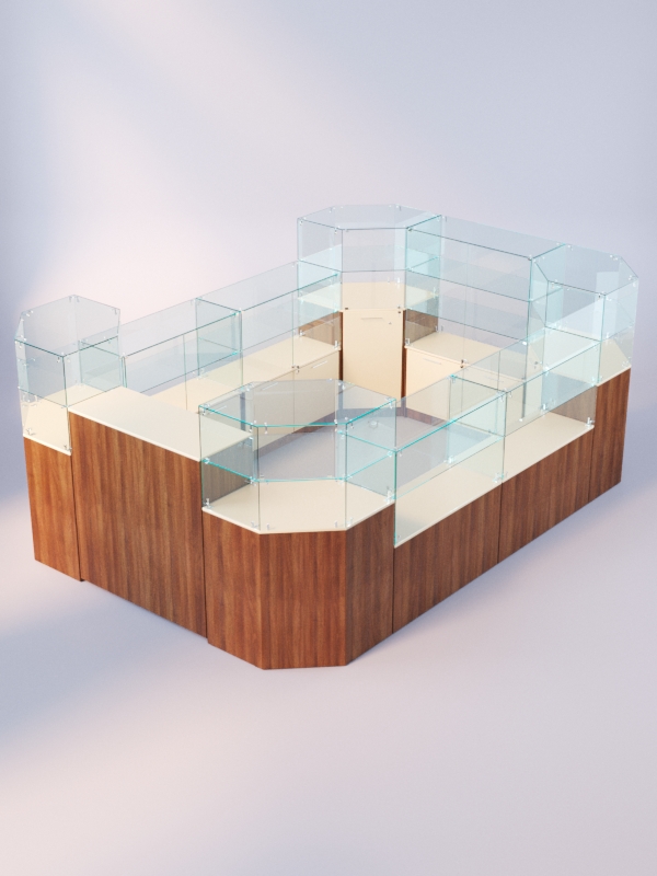Данная модель представляет собой закрытую систему из нескольких прилавков. Сюда входят прилавки с витриной, содержащие разное количество полок, а также закрытый выкатной прилавок.