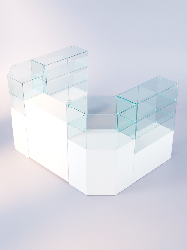 Данная модель представляет собой симметричную открытую систему из нескольких прилавков. Сюда входят прямоугольные прилавки с витриной, содержащие две полки, шестиугольные прилавки с одной полкой, а также закрытый выкатной прилавок.