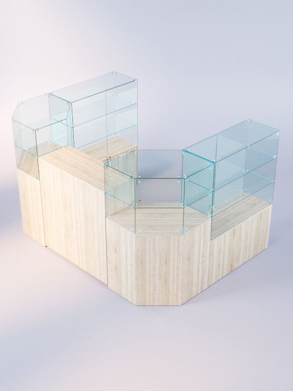 Данная модель представляет собой симметричную открытую систему из нескольких прилавков. Сюда входят прямоугольные прилавки с витриной, содержащие две полки, шестиугольные прилавки с одной полкой, а также закрытый выкатной прилавок.