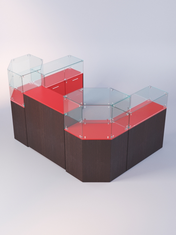 Данная модель представляет собой открытую симметричную систему из нескольких прилавков. Сюда входят прямоугольные прилавки с витриной, шестиугольные прилавки с одной полкой, а также закрытый выкатной прилавок.
