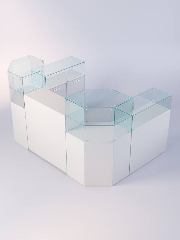 Данная модель представляет собой открытую симметричную систему из нескольких прилавков. Сюда входят прямоугольные прилавки с витриной, шестиугольные прилавки с одной полкой, а также закрытый выкатной прилавок.