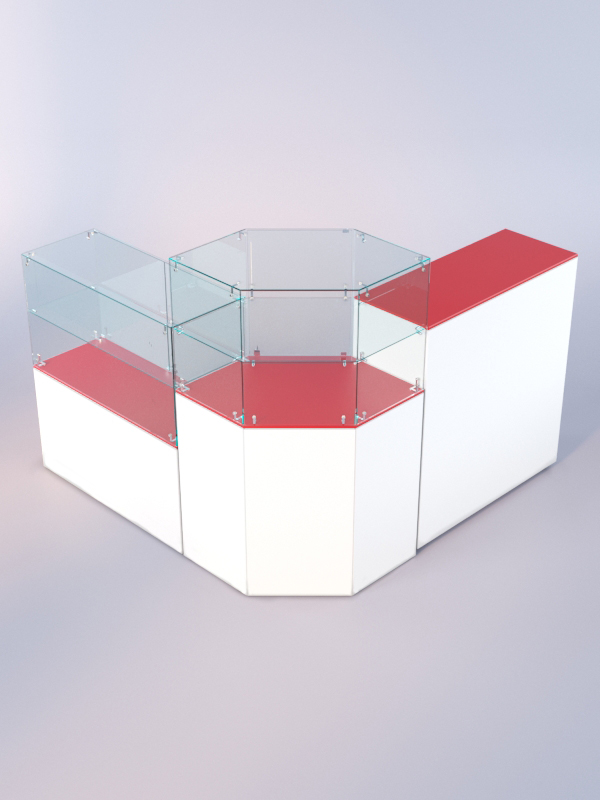 Данная модель представляет собой открытую угловую систему из нескольких прилавков. Сюда входят прямоугольный прилавок с полкой, шестиугольный прилавок с полкой, а также закрытый выкатной прилавок.