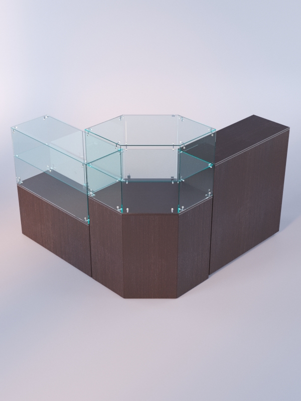 Данная модель представляет собой открытую угловую систему из нескольких прилавков. Сюда входят прямоугольный прилавок с полкой, шестиугольный прилавок с полкой, а также закрытый выкатной прилавок.