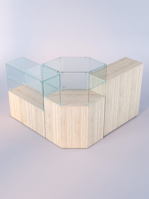 Данная модель представляет собой открытую угловую систему из нескольких прилавков. Сюда входят прямоугольный прилавок с полкой, шестиугольный прилавок с полкой, а также закрытый выкатной прилавок.