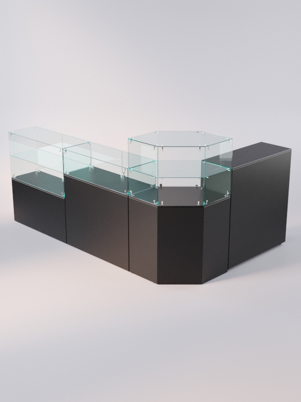 Данная модель представляет собой открытую систему из нескольких прилавков. Сюда входят прямоугольные прилавки с полкой и без полок, шестиугольный прилавок с полкой, а также закрытый выкатной прилавок.