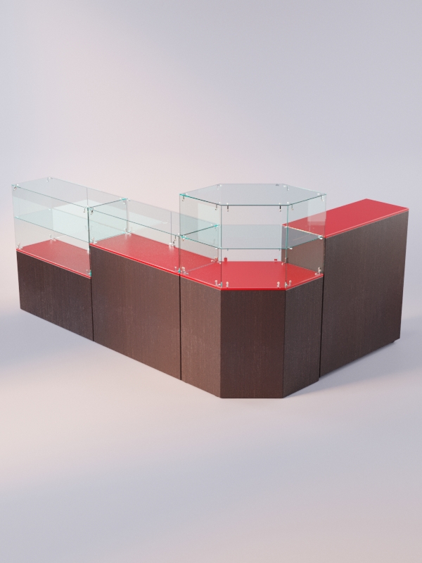Данная модель представляет собой открытую систему из нескольких прилавков. Сюда входят прямоугольные прилавки с полкой и без полок, шестиугольный прилавок с полкой, а также закрытый выкатной прилавок.