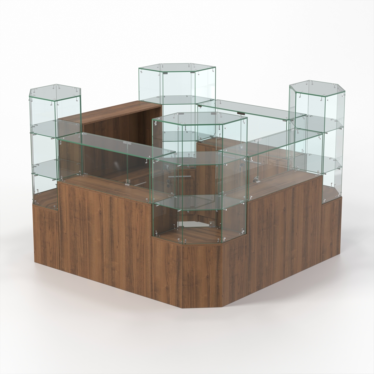 Комплект включает три прямоугольных прилавка, четыре шестиугольных прилавка, а также закрытый прилавок.