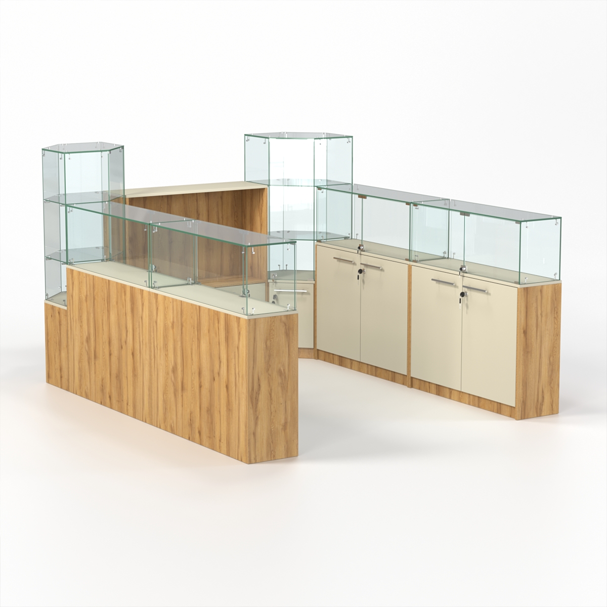 Каркас прилавков выполнен из ЛДСП. Витрины и полки — стеклянные. При равномерном распределении предметов нагрузка на полку составляет 5-7кг.