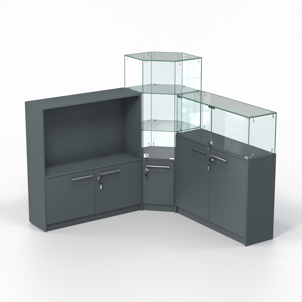 Конструкция состоит из прямоугольного, шестиугольного и закрытого прилавков, расположенных в форме угла.