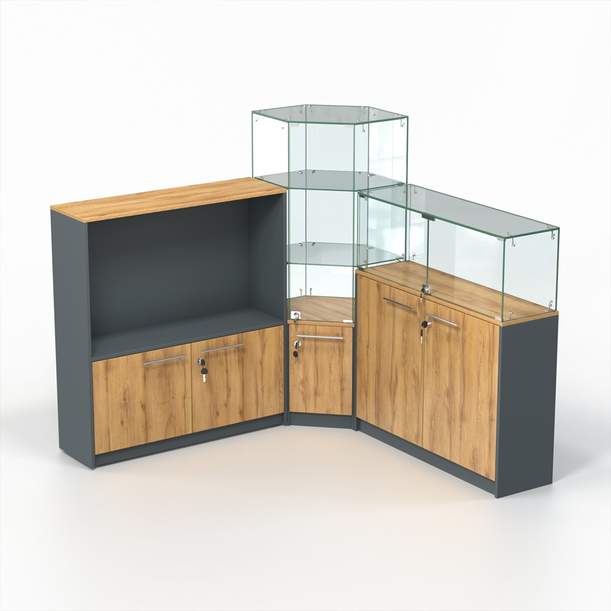Конструкция состоит из прямоугольного, шестиугольного и закрытого прилавков, расположенных в форме угла.