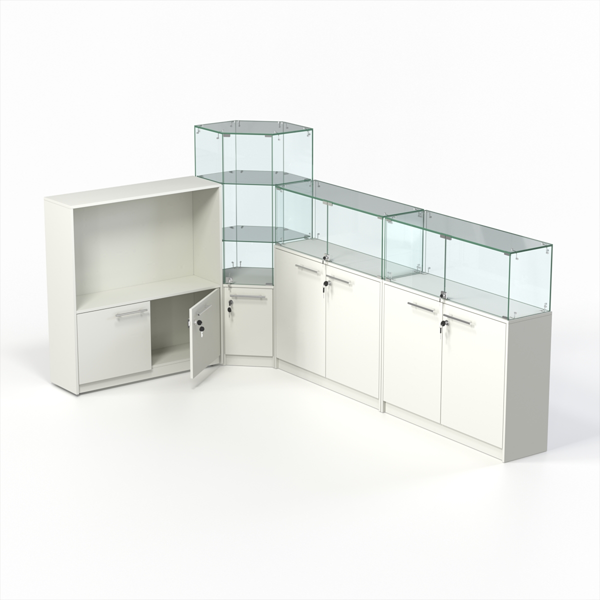 Комплект включает два прямоугольных прилавка, шестиугольный и закрытый прилавки.