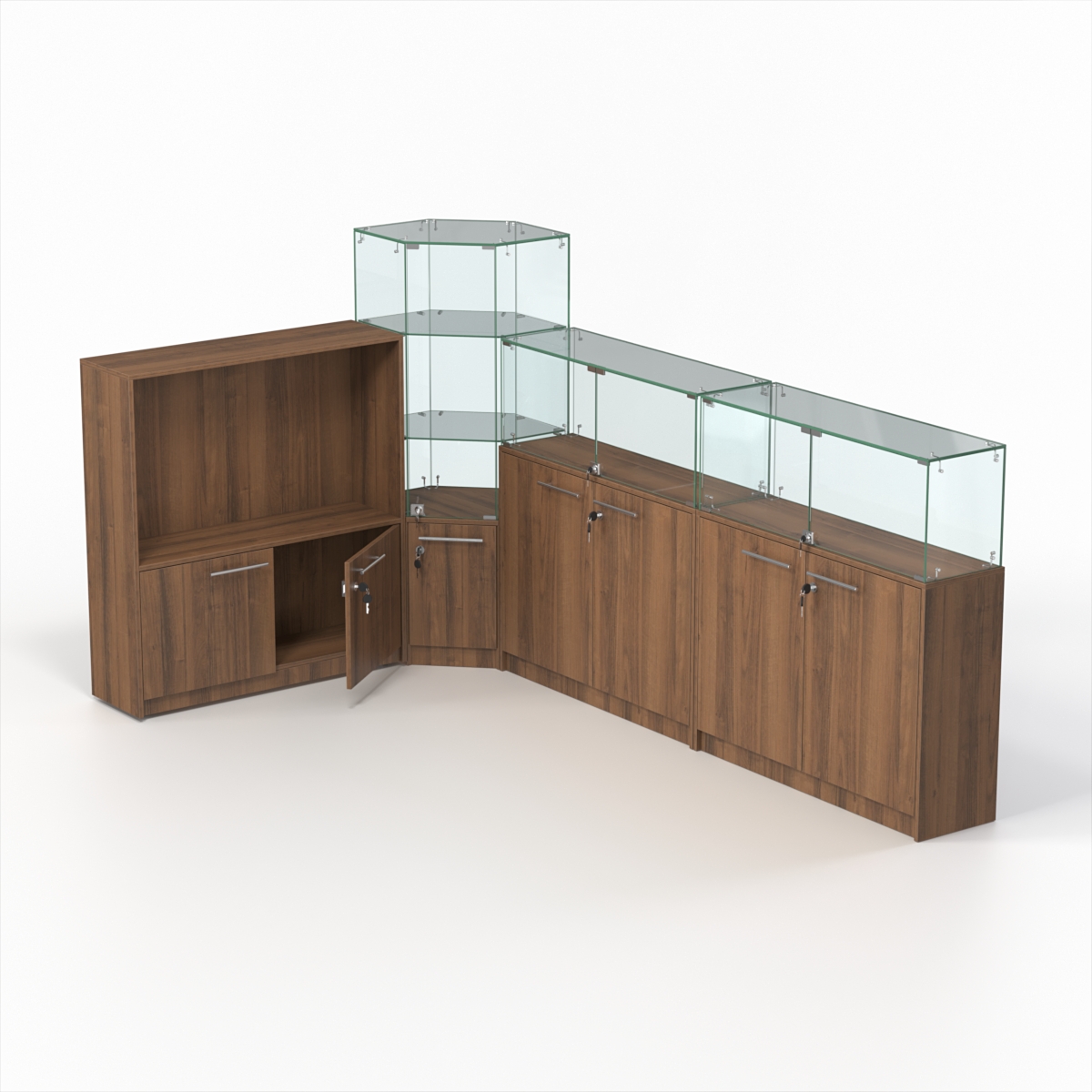 Комплект включает два прямоугольных прилавка, шестиугольный и закрытый прилавки.