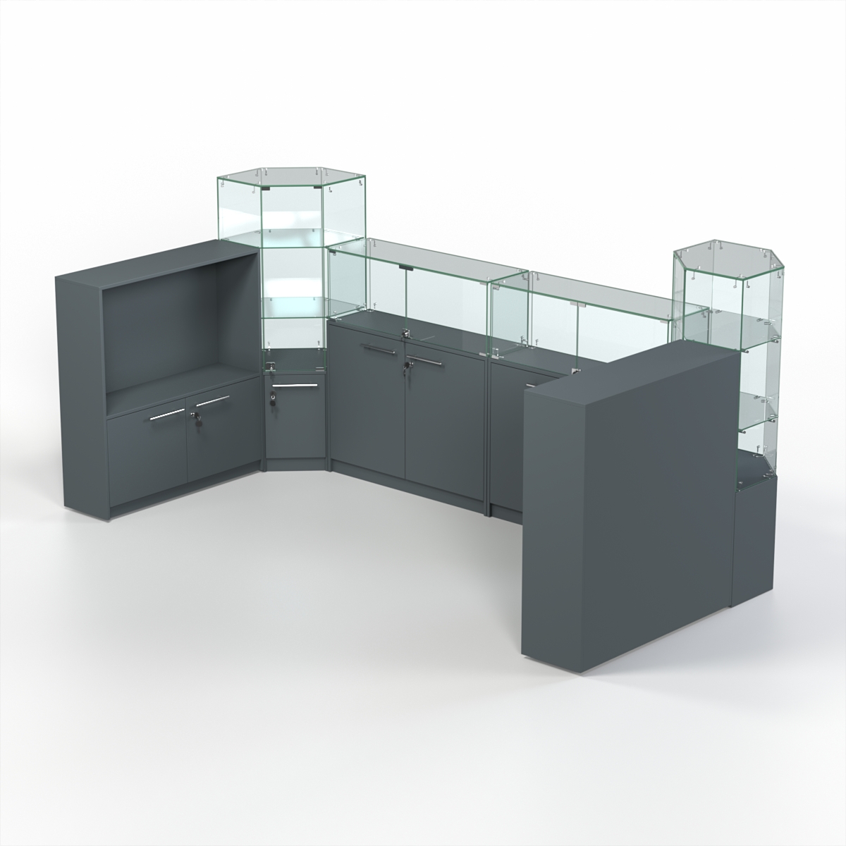 Комплект прилавков предназначен для оборудования торговой точки в универмаге, торговом центре, здании вокзала.