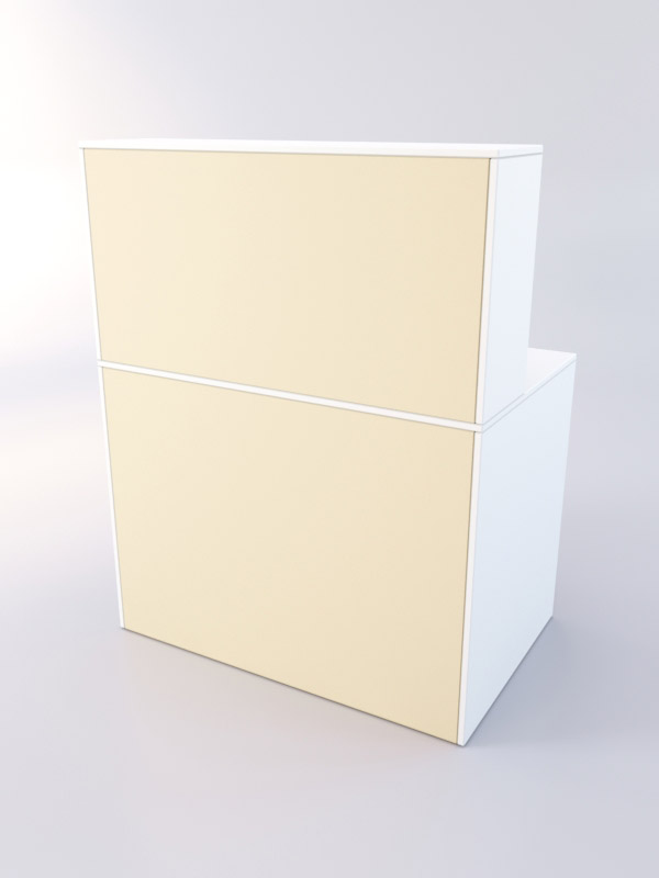 Модель состоит из двух столешниц, между которыми находится панель с полкой и тремя секциями для размещения бумаг или служебного инвентаря. Широкая нижняя столешница предназначена для установки техники и работы персонала.