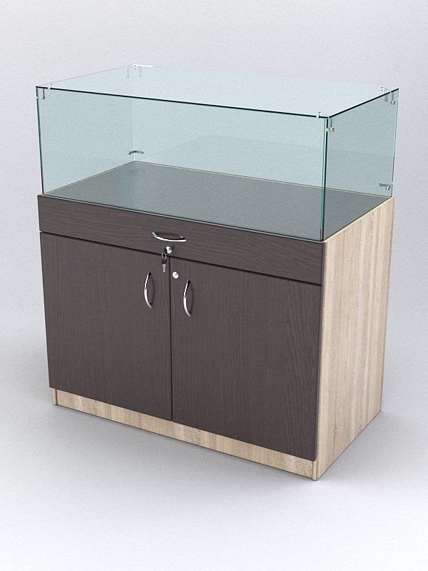 Накопитель оборудован двумя распашными дверцами. Полка витрины представляет собой выдвижной ящик. Дверцы и ящик закрываются на ключ.