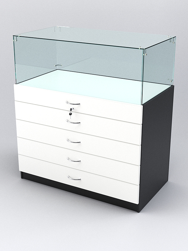 Накопитель оборудован четырьмя выдвижными ящиками. Пятым выдвижным ящиком является полка витрины. Ящик с полкой закрываются на ключ.