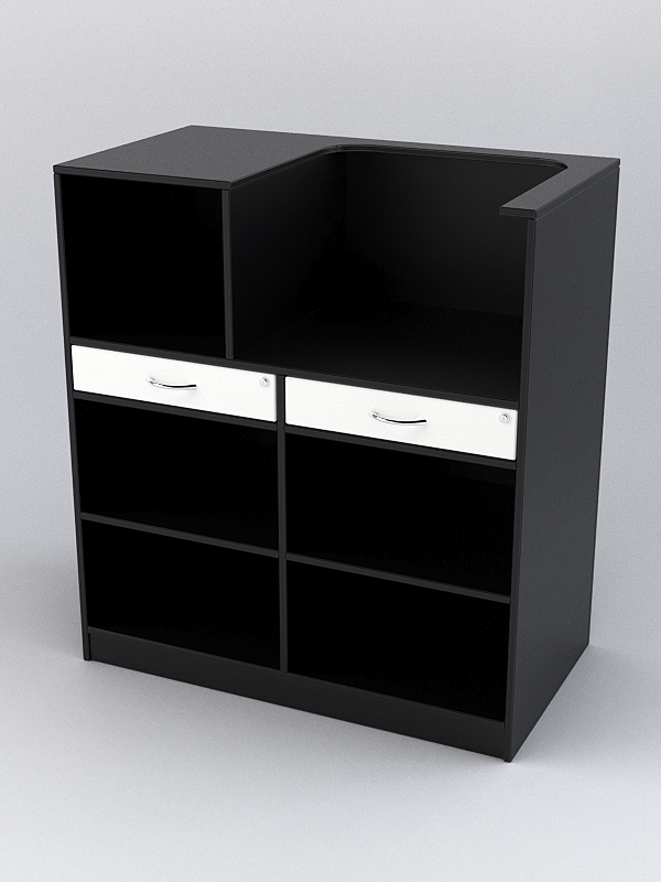Кассовый прилавок отличается оригинальной формой, имеет просторную конструкцию, оснащен множеством отделений.