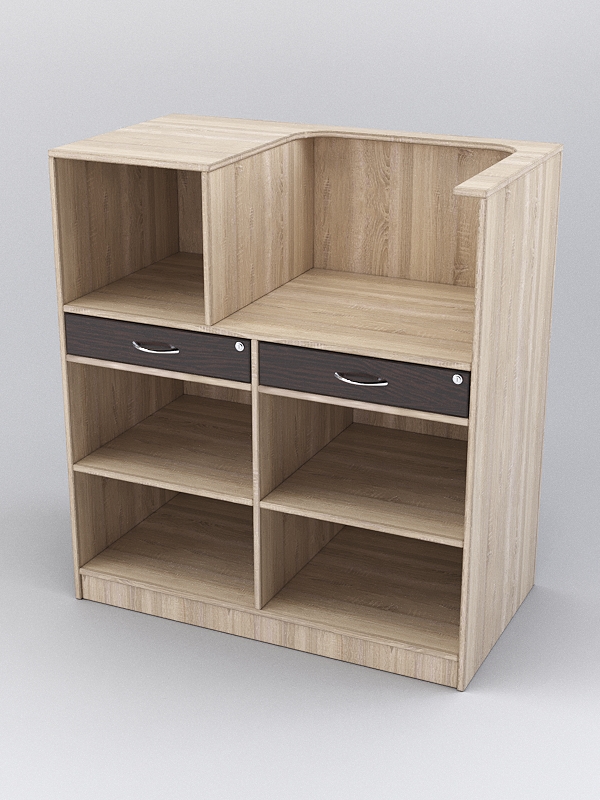 Кассовый прилавок отличается оригинальной формой, имеет просторную конструкцию, оснащен множеством отделений.