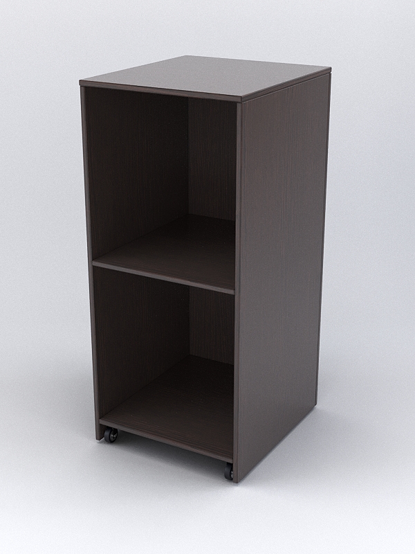 Прилавок служит входом в торговую зону. Фасад закрытый. С внутренней стороны имеется полка. Для удобства перемещения основание прилавка оборудовано колесами.