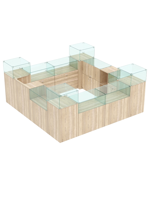 Комплект включает квадратные прилавки с витриной, кассовые прилавки, прилавки с выдвижными ящиками, прилавки с распашными дверцами.