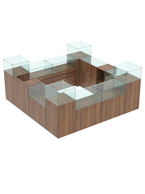 Комплект включает квадратные прилавки с витриной, кассовые прилавки, прилавки с выдвижными ящиками, прилавки с распашными дверцами.