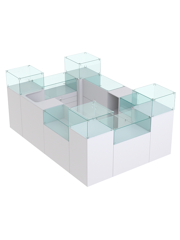 Комплект включает квадратные прилавки с витриной, кассовые прилавки, прилавки с выдвижными ящиками, прилавки с распашными дверцами.
