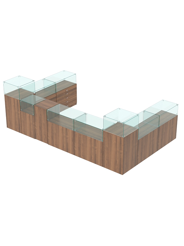 Комплект включает квадратные прилавки с витриной, прилавки с выдвижными ящиками, прилавки с дверцами и выкатной прилавок.