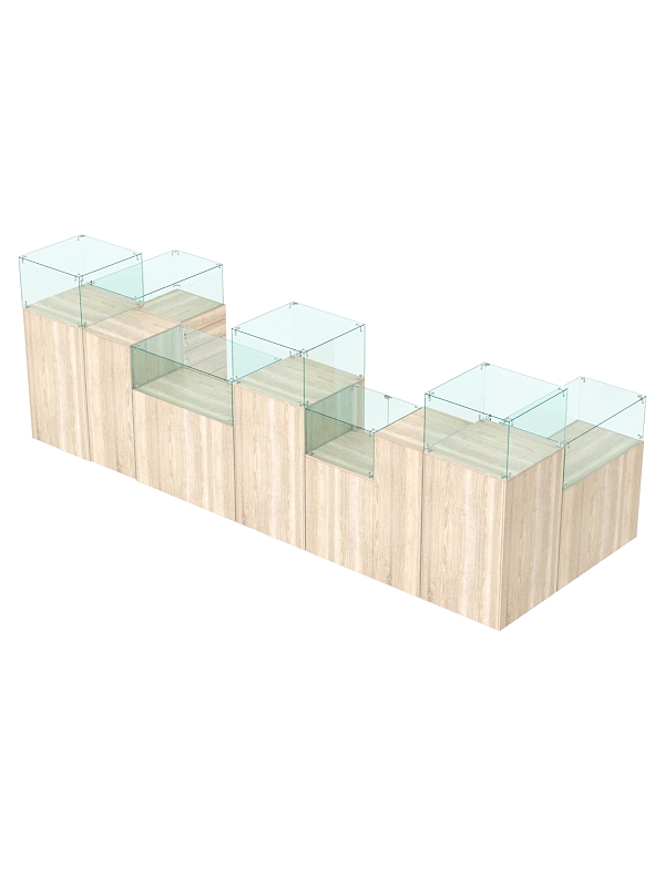 Комплект включает квадратные прилавки с витриной, прилавки с выдвижными ящиками, кассовый и выкатной прилавки.