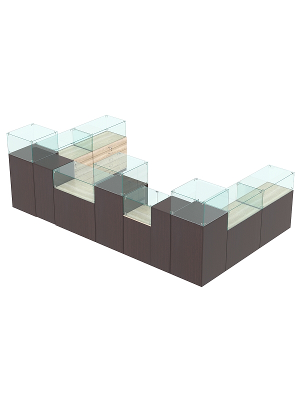 Комплект включает квадратные прилавки с витриной, прилавки с выдвижными ящиками, прилавок с дверцей и выкатной прилавок.