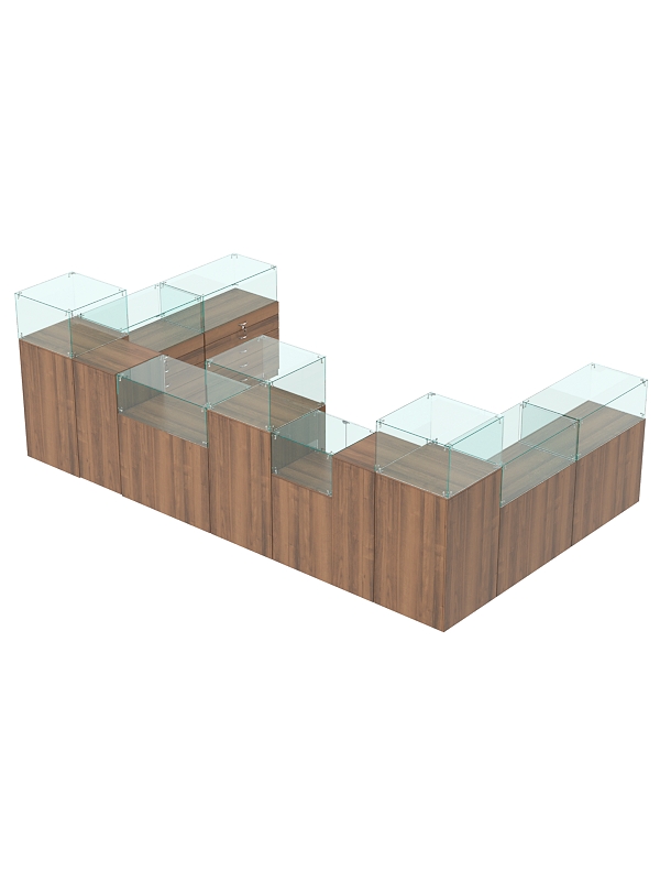 Комплект включает квадратные прилавки с витриной, прилавки с выдвижными ящиками, прилавок с дверцей и выкатной прилавок.