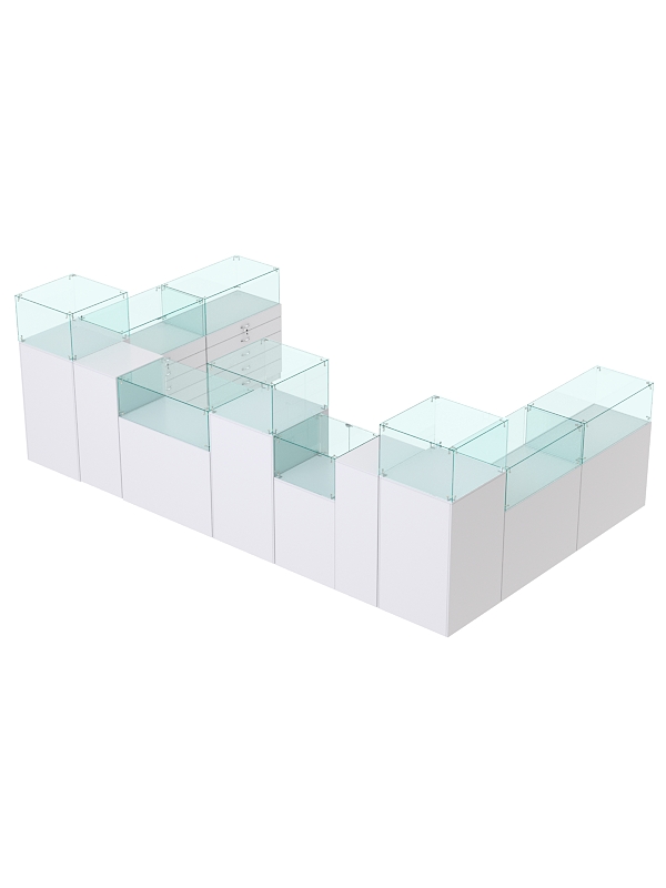 Комплект включает квадратные прилавки с витриной, прилавки с выдвижными ящиками, прилавок с дверцей и выкатной прилавок.
